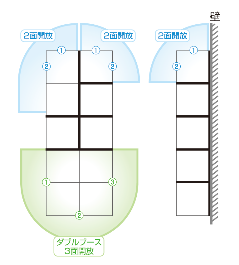 2面開放指定権にお申し込みいただきますと、角ブース(2面開放)をご用意いたします。